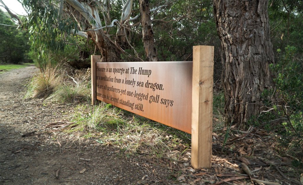 As part of my work for environmental charity Remember The Wild, I managed and completed an ecopoetry trail installation in 2018 for the Point Leo Foreshore Park and Reserve Committee. Written by Melbourne poet Michelle Leber, ‘Talking to the Shoreline’ is a poetic sequence that acknowledges the cultural identity and natural environment of Point Leo, located on the Mornington Peninsula in Victoria. The signs are constructed from corten steel with the letters of each word laser-cut, creating a fusion between the evocative words of Michelle’s poem and the surrounding coastal vegetation.